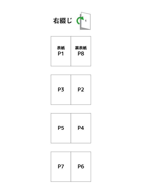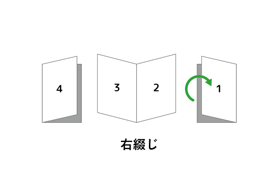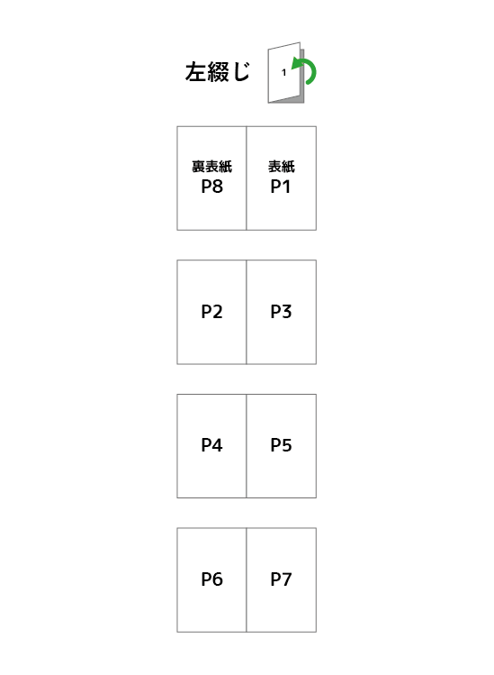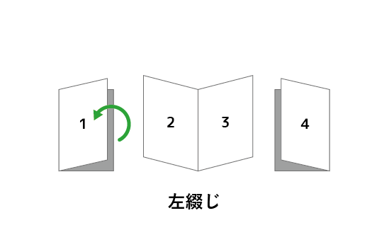 見開き(2ページ1組)のデータでご入稿いただくことも可能ですが、綴じ方向(左綴じ・右綴じ)によってページの配置順が異なります。